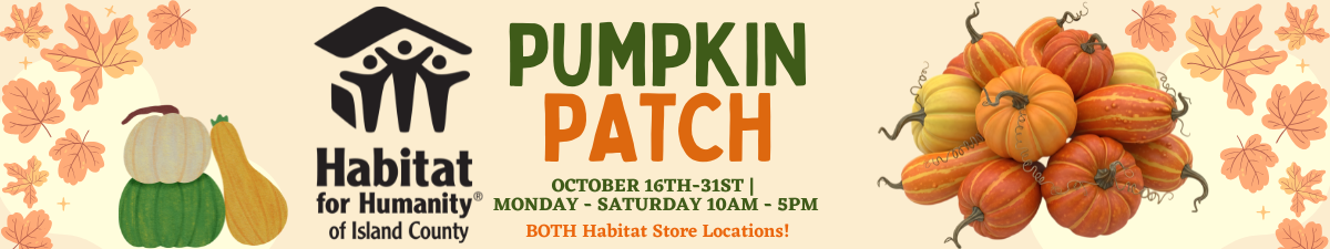 Celebrate the season at the Island County Habitat Pumpkin Patch! From October 16th–31st, stop by either of our Habitat Store locations, Monday through Saturday, 10 AM–5 PM, to pick out the perfect pumpkin.